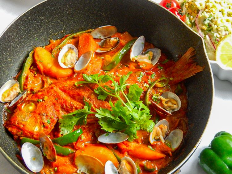 この料理はインドの作り方に忠実なわけではなく、私の創作料理です。「マチェルジョル」には使わないココナッツミルクを入れたり、インドではあまり食べない貝を最後に飾ったりしています。でもおいしいからいい!ことにします。