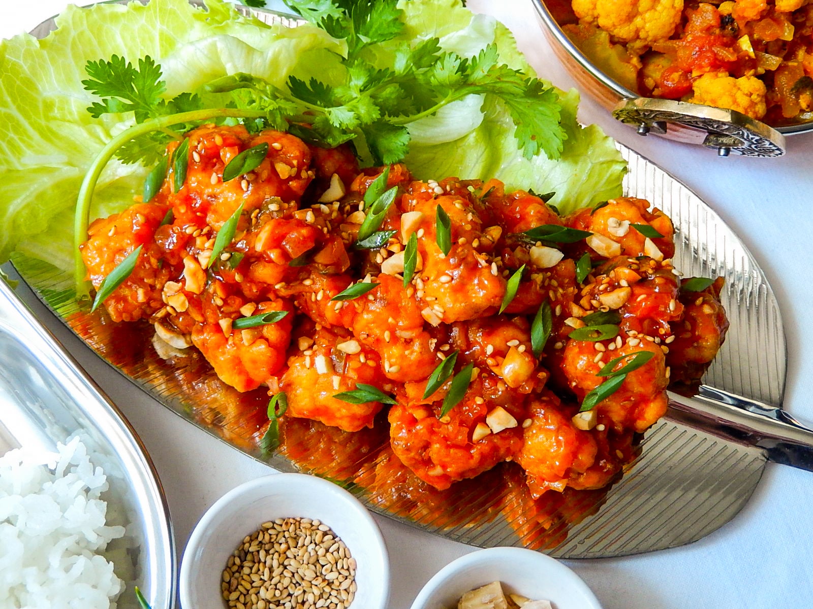 カリフラワーの天ぷらに甘辛いたれをからめたインド・チャイニーズ