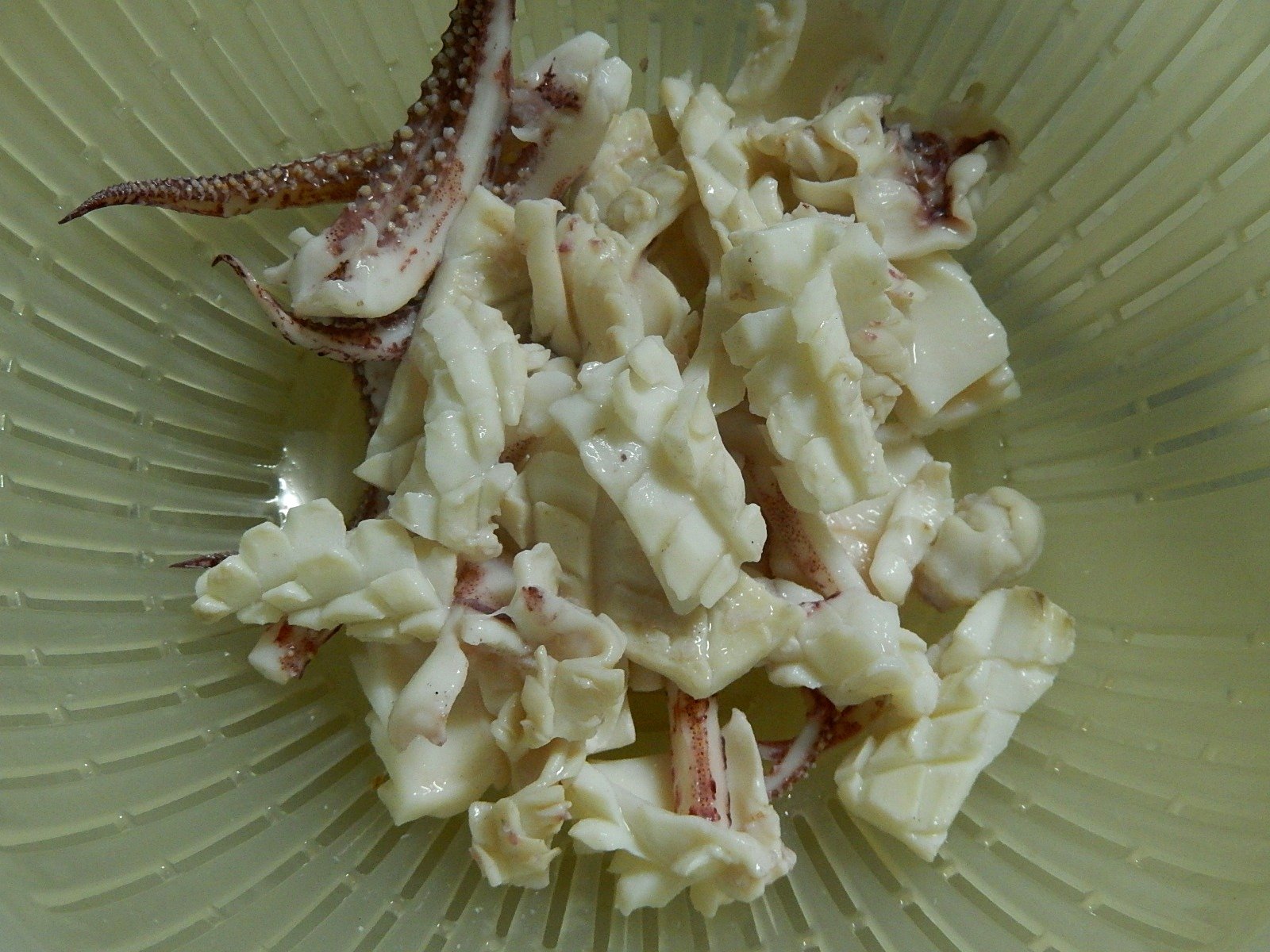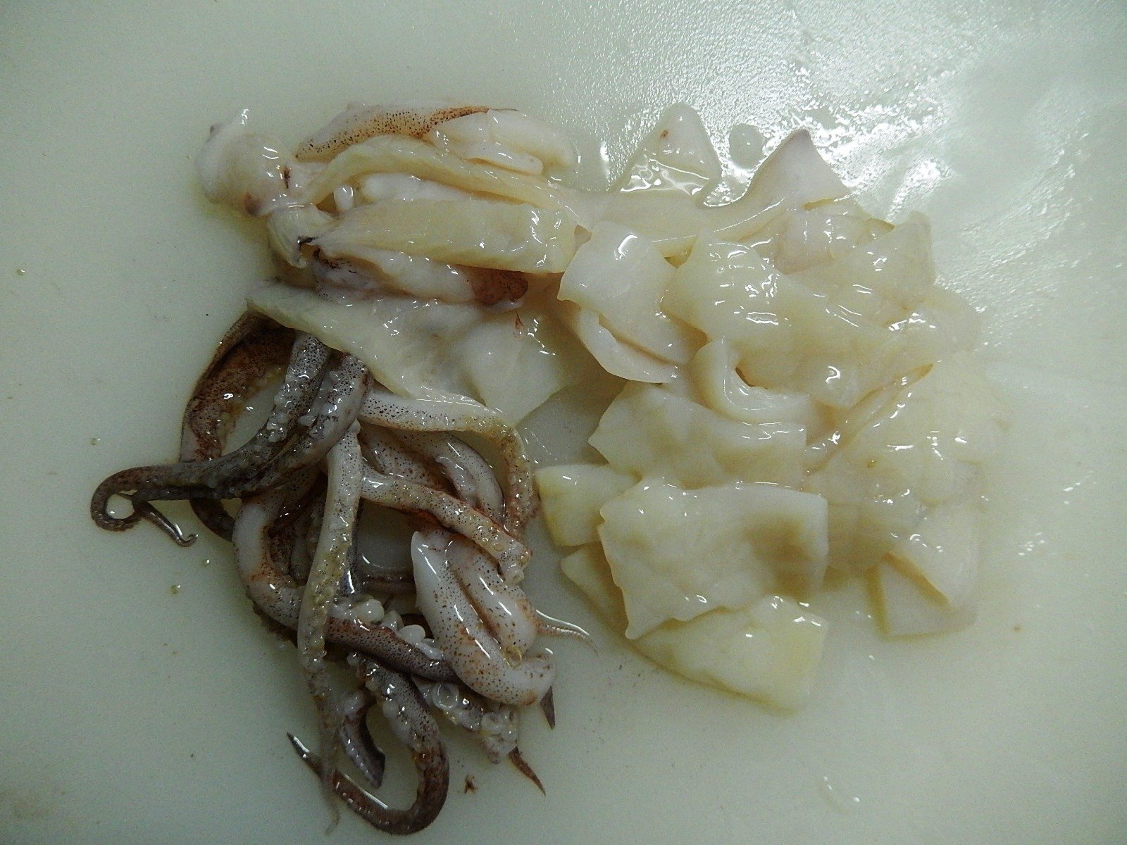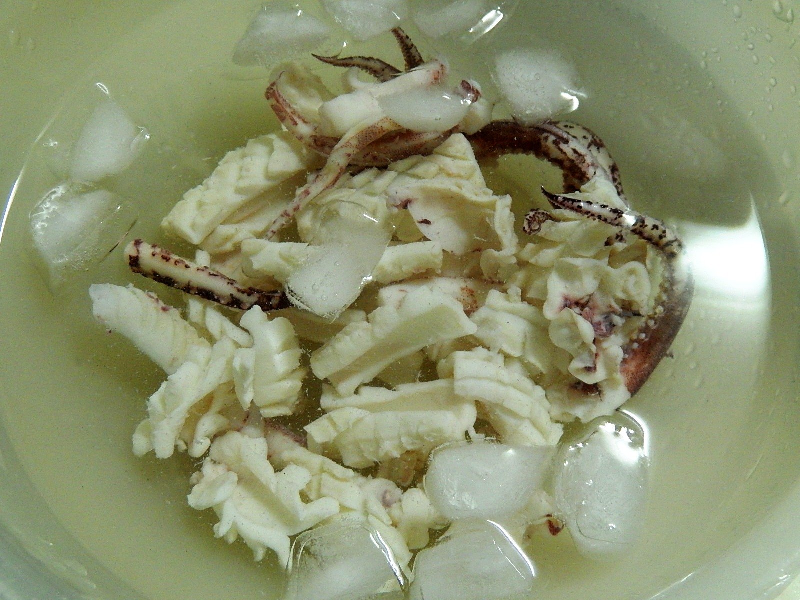 今回は、開いたイカの内側に切れ目を入れてから、裏返して縦3つに切り、それをそれぞれ2cm幅ぐらいに切りました。(松笠切りというそうです)