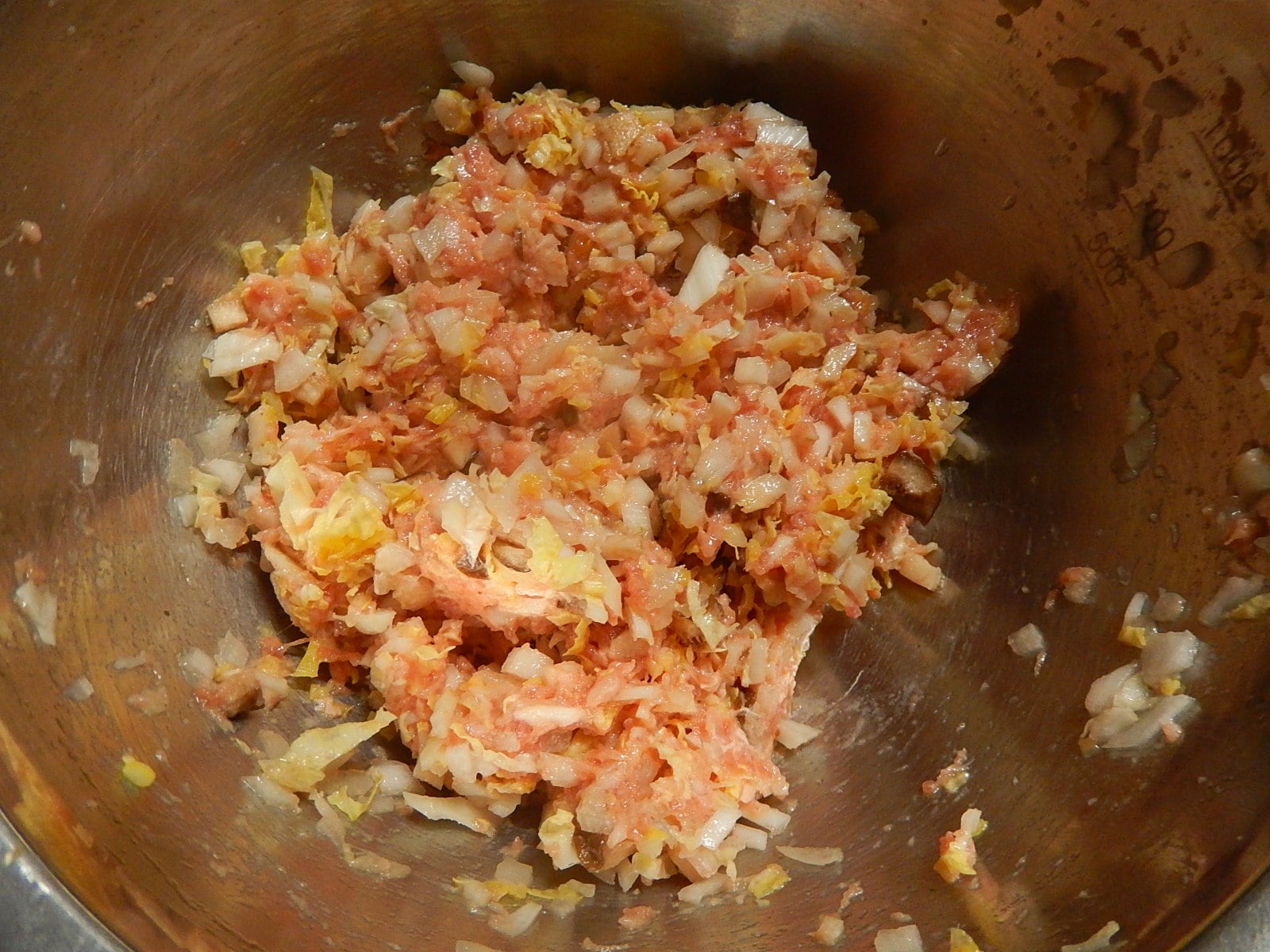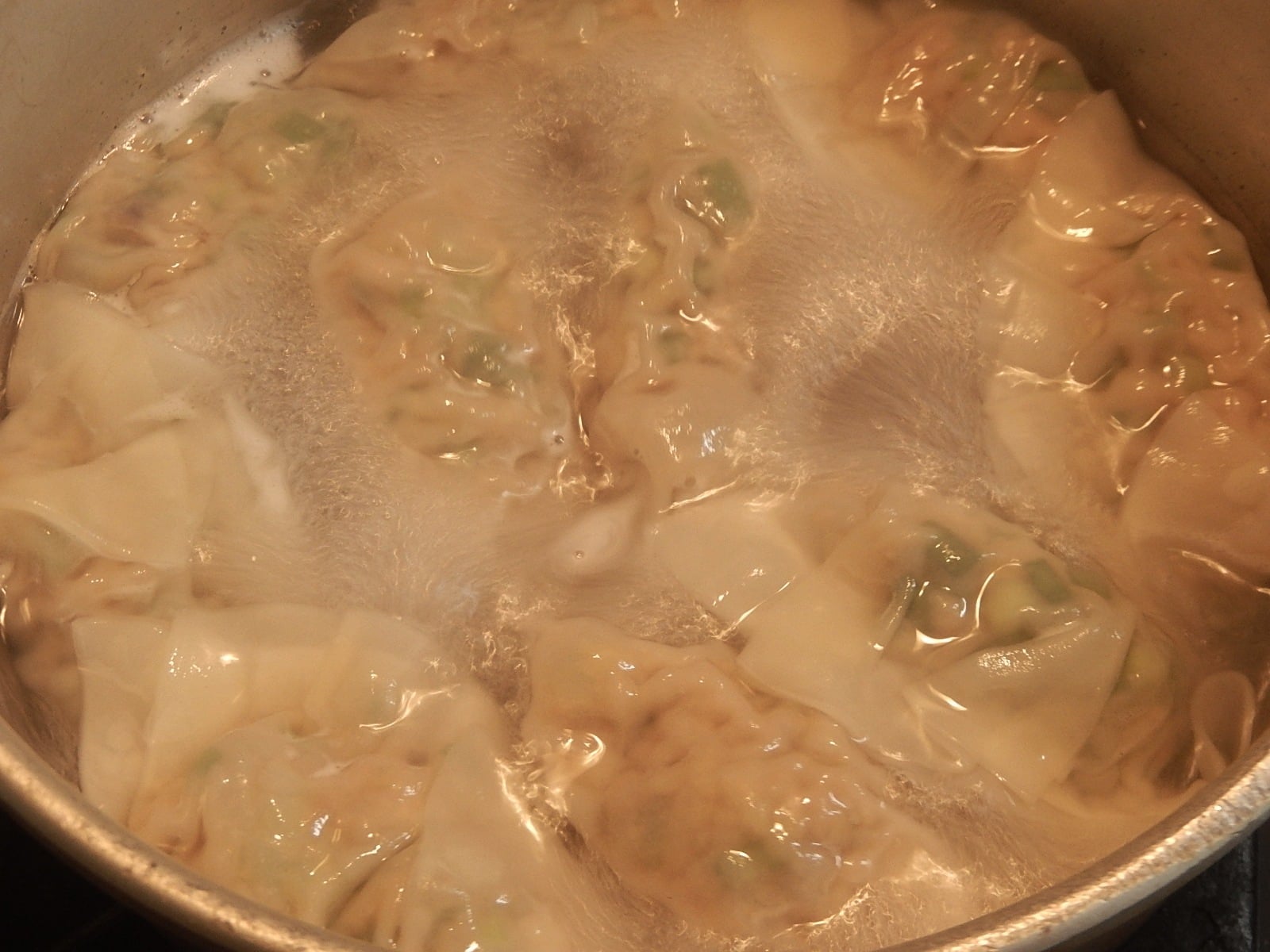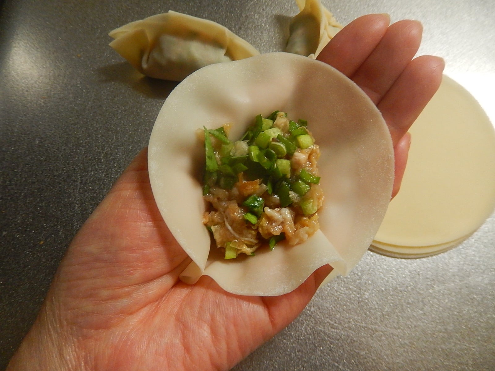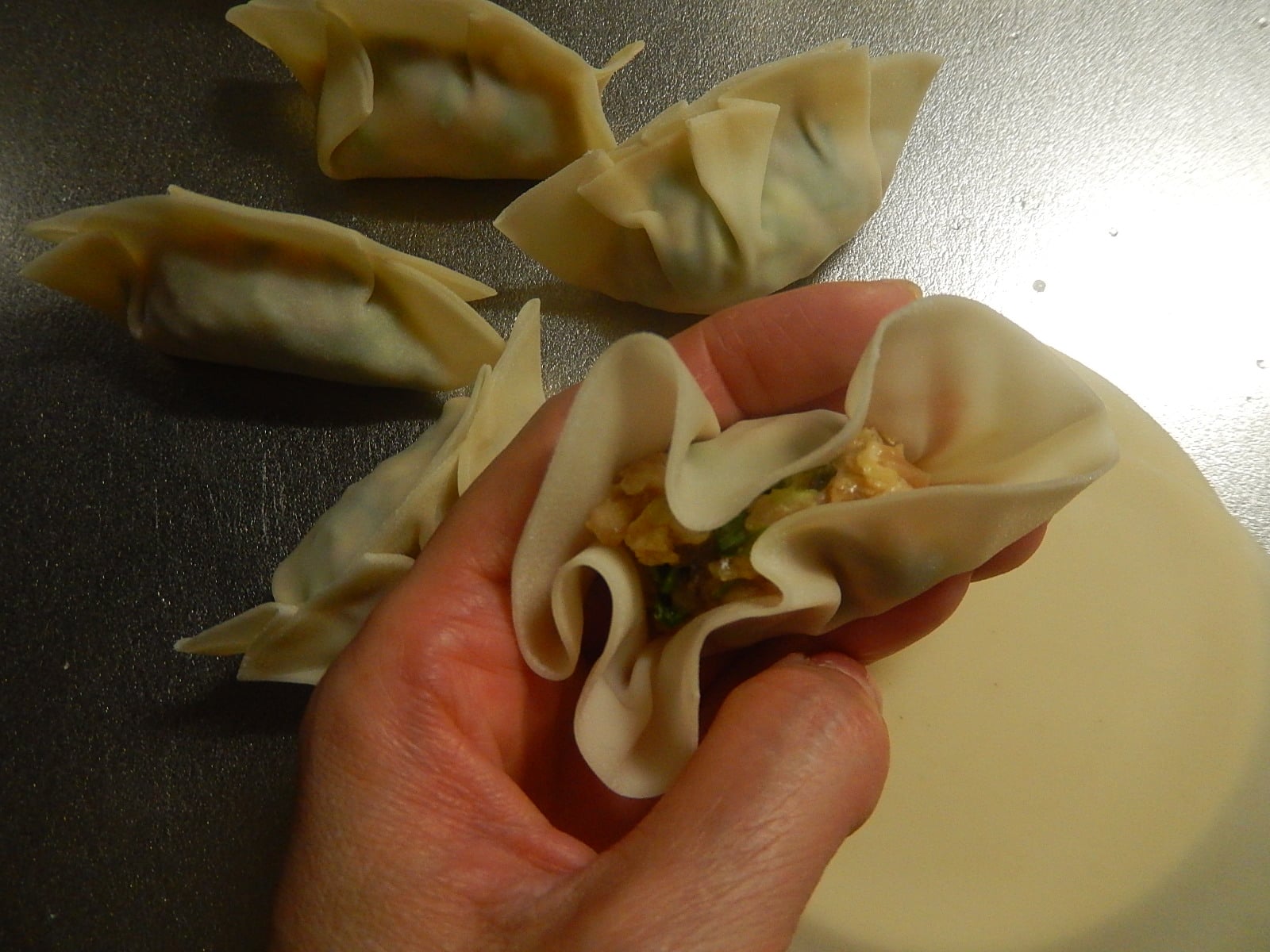 ひだは、あえて大雑把に寄せるだけにします。餃子とワンタンの中間のようなかんじです。ただし縁に水をつけて口がしっかり閉じるようにします。