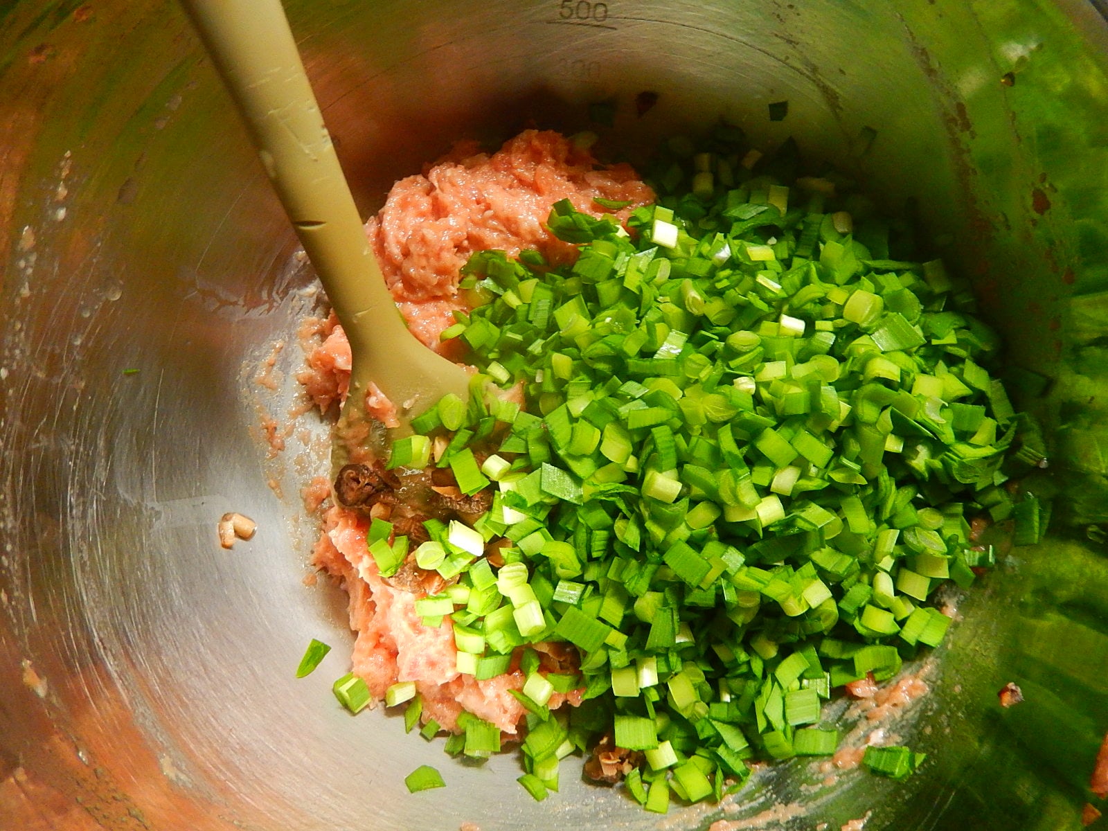にらがたっふり入った水餃子。にんにくたっぷりのたれで食べる台湾風です