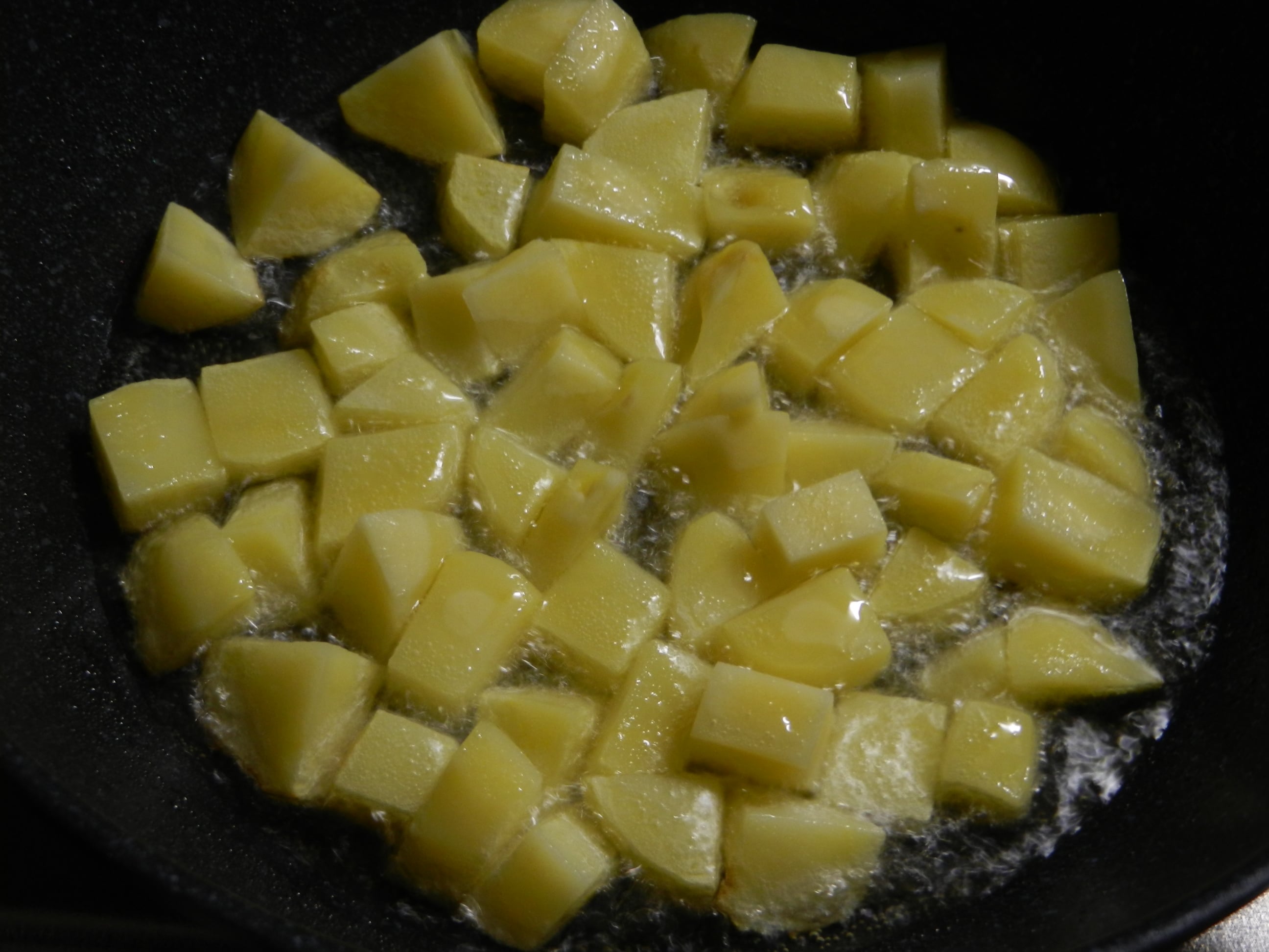 じゃがいもは、表面が軽く色づくまで素揚げしてから加えることで、生のまま加えて煮るよりも、料理全体に甘みとコクが加わります。