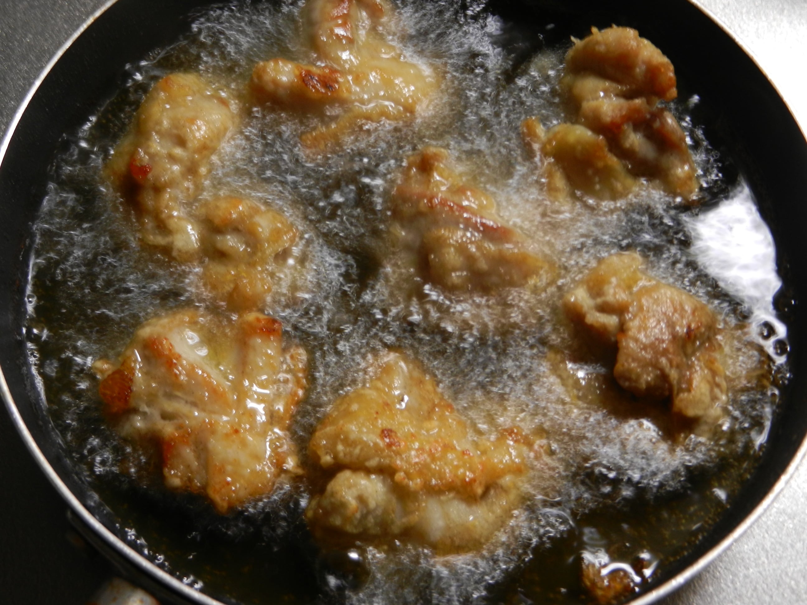 低温で揚げて、休ませて予熱で火を通し、高温で二度揚げすることで、外側はカリッと、柔らかくジューシーに仕上がります。