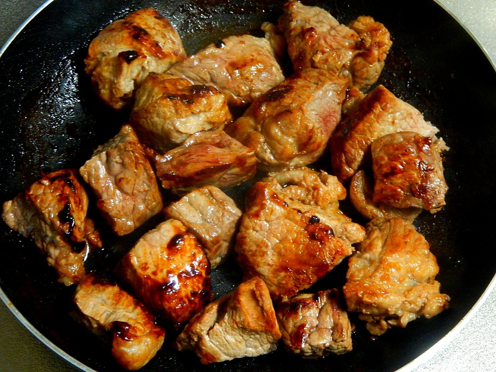 2の工程でフライパンについた焦げはメイラード反応のおいしい旨味ですので、水で溶かして残さず煮込みの鍋に加えます。
