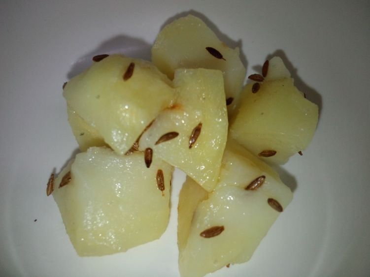 一番手軽で簡単なインド料理がこれ! アルジーラです。アルとはじゃがいも、ジーラはスパイスのクミンのことで、一言で言うと、じゃがいものクミン炒め。 クミンはカレーの中にも入っているスパイスですが、 じゃがいもとの相性がバッチリで、ただ一緒に炒めただけなのに、本当にインドらしく、美味しく出来上がるんです。 口の悪い人に言わせると、「鉛筆の芯の味がする」とか言いますが、そんな時はもう一寸油を足してあげると美味しくなると思います。