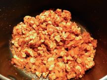 材料の切り方にはきまりはありません。今回は2つに切るときに切りやすいようにと肉を刻みましたが、お肉の存在感を残したい場合はもっと大きめに切って調理してもOKです。