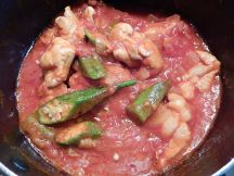The proper recipe calls for chicken, hot chili, garlic, tomato, pepper, salt, okra and palm butter.