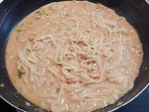 卵入りの手打ちパスタで作ってもおいしいです。ただし乾燥スパゲティは向きません。