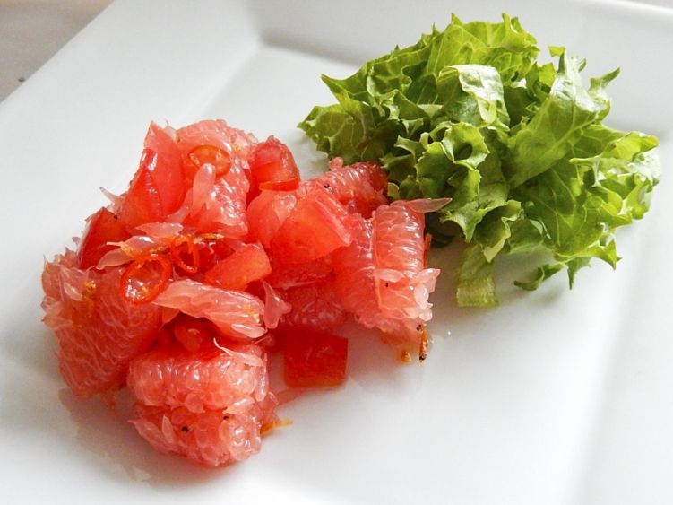 ベトナム人はこのフルーツに塩唐辛子を付けて食べるのだとか。塩辛くして食べるのが普通とのことで、ザボンはサラダになっていることもあります。ということで、味が似ているグレープフルーツで作ってみたのがこのレシピです。