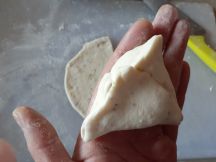 包む皮は、水分が多く生地が柔らか過ぎると、包む時に生地が破れやすく、型を作りにくいので、固すぎず柔らか過ぎない固さにしてみて下さい。